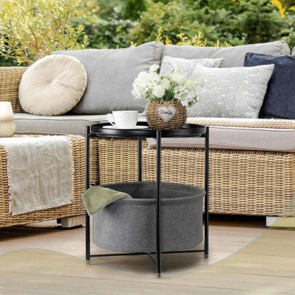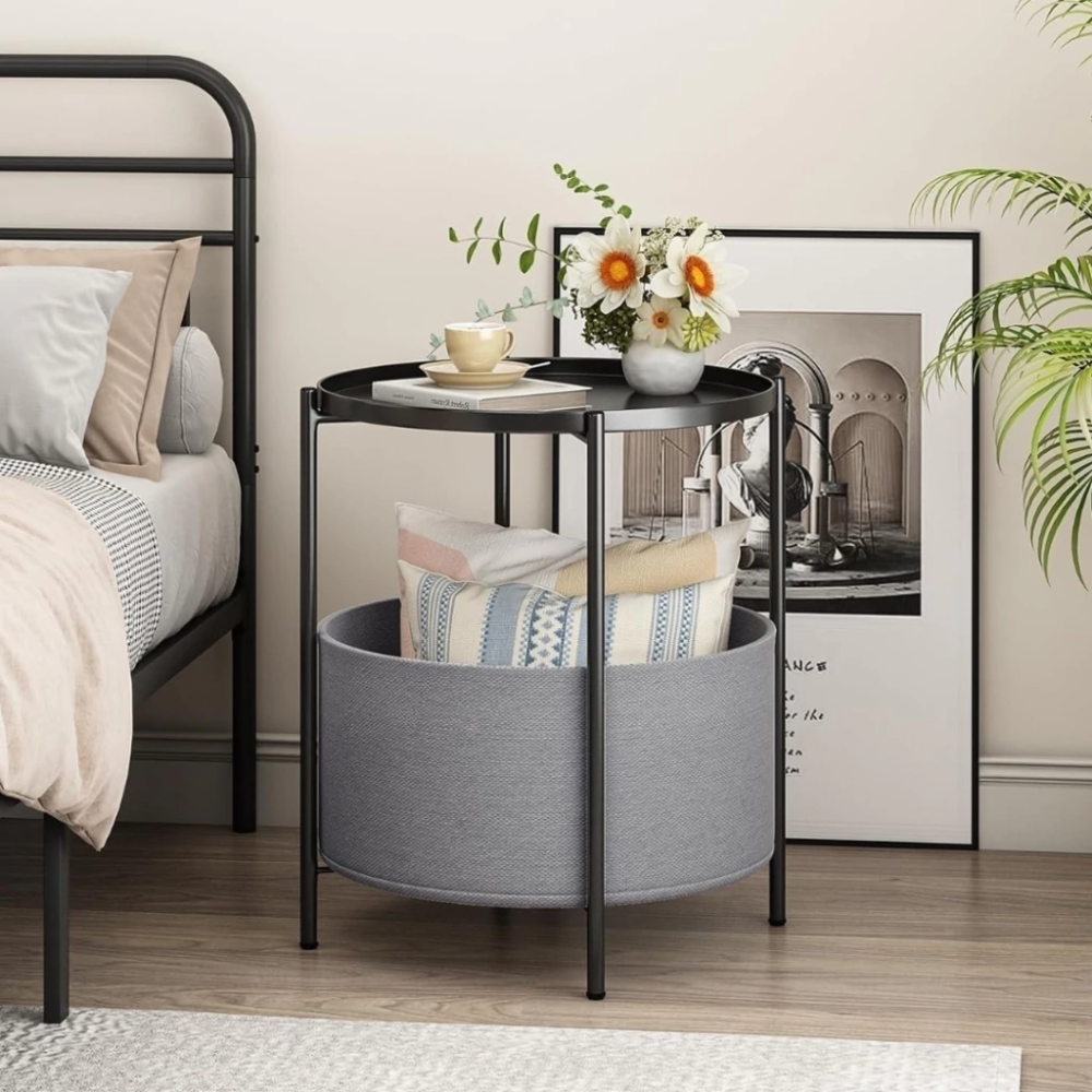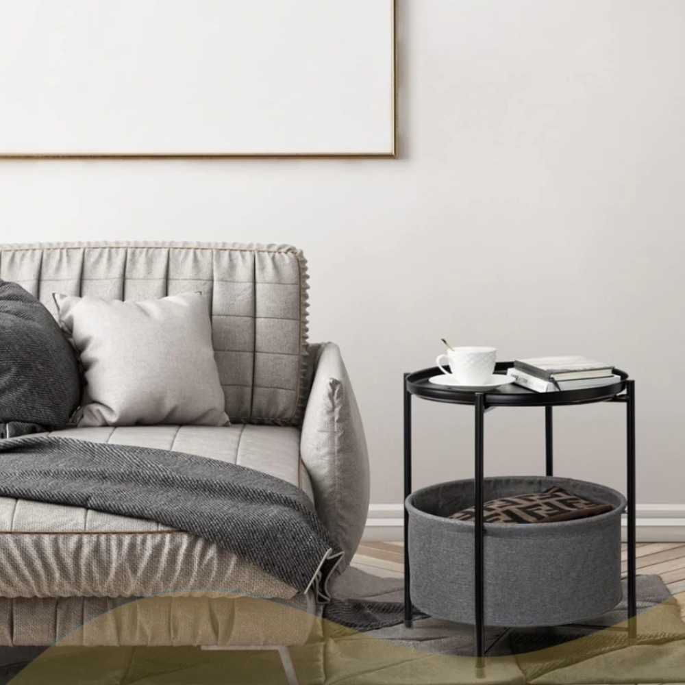 Diseño Multifuncional: Este producto integra tres funciones clave: una mesa auxiliar, una bandeja superior removible y una cesta de almacenamiento de tela. Es la solución perfecta para organizar y exhibir objetos en salas de estar, dormitorios, estudios o recibidores.