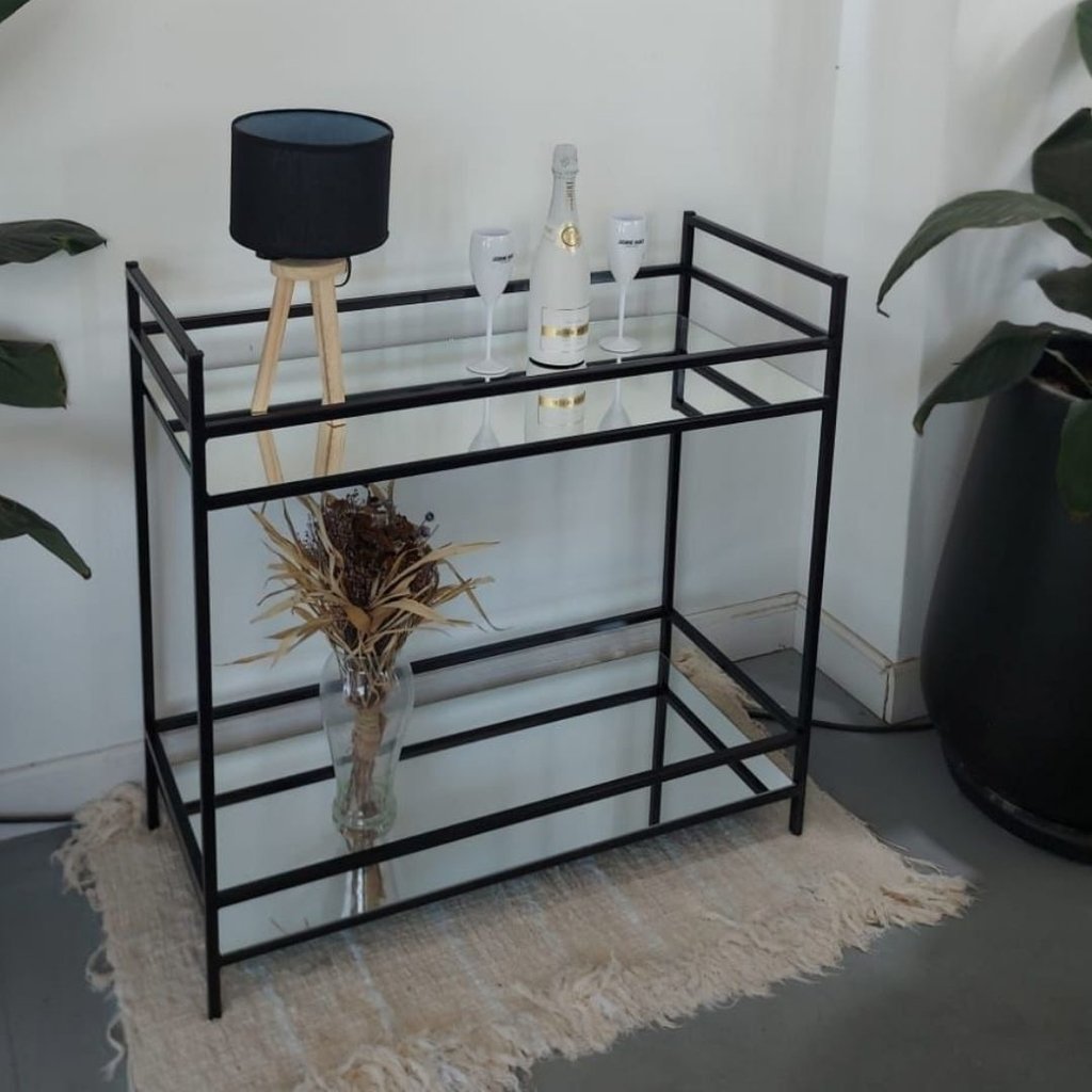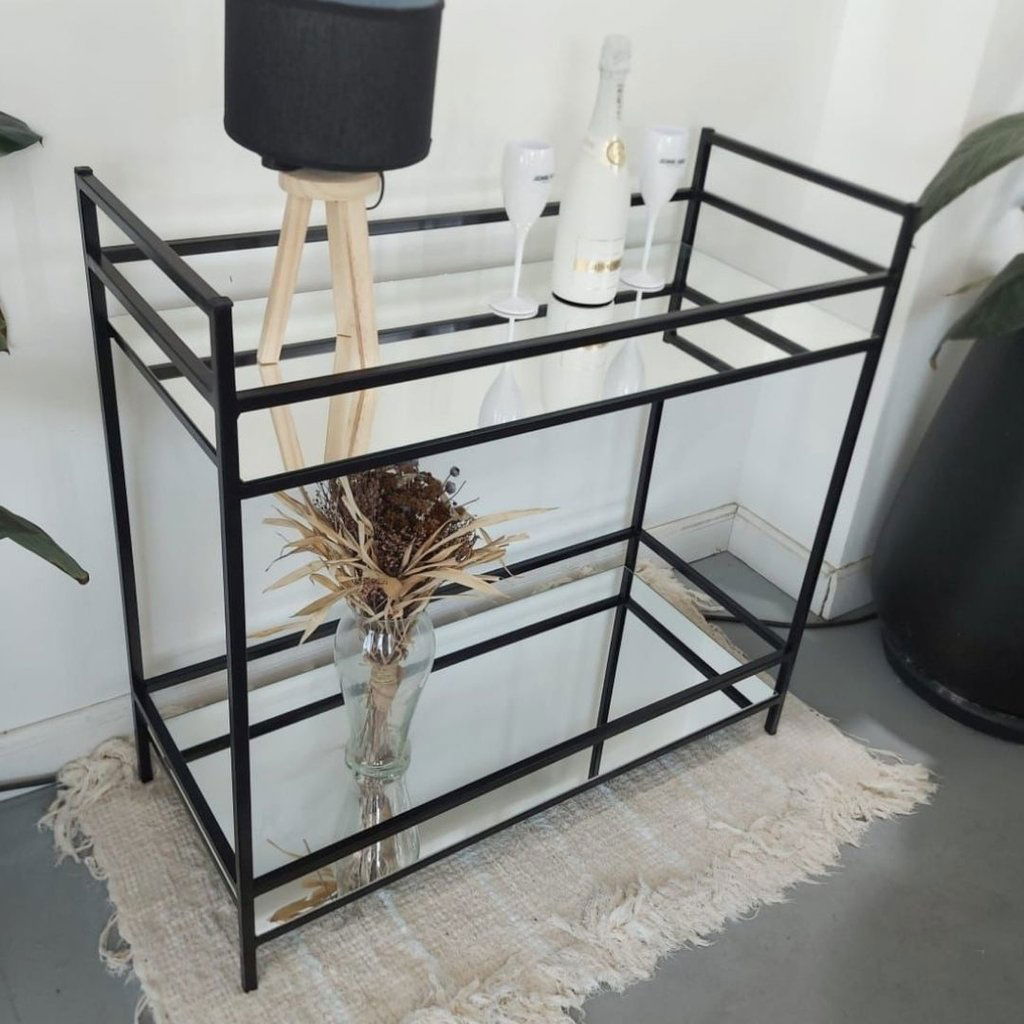 • **MINIBAR INDUSTRIAL ESPEJADO porta botellas y copas**: Largo: 80cm Ancho: 40cm Altura: 87cm Color negro.Terminación con pintura epoxi y secado en horno.
