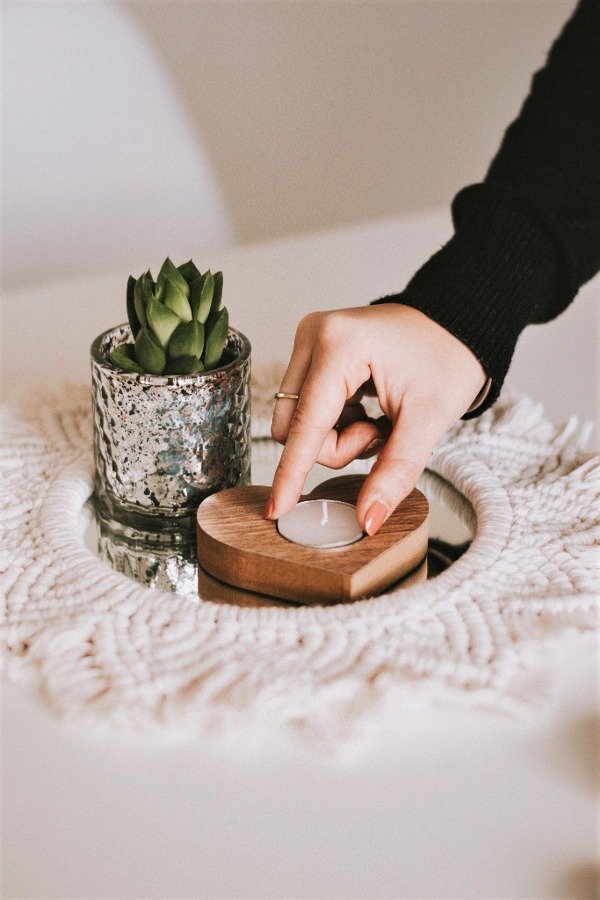 • **Portavelas con vela incluida **_Medida_**s**: 10cm x 9cm Material: Melamina 18mm Colores: Helzinki, báltico, olmo finlandés y terrarum