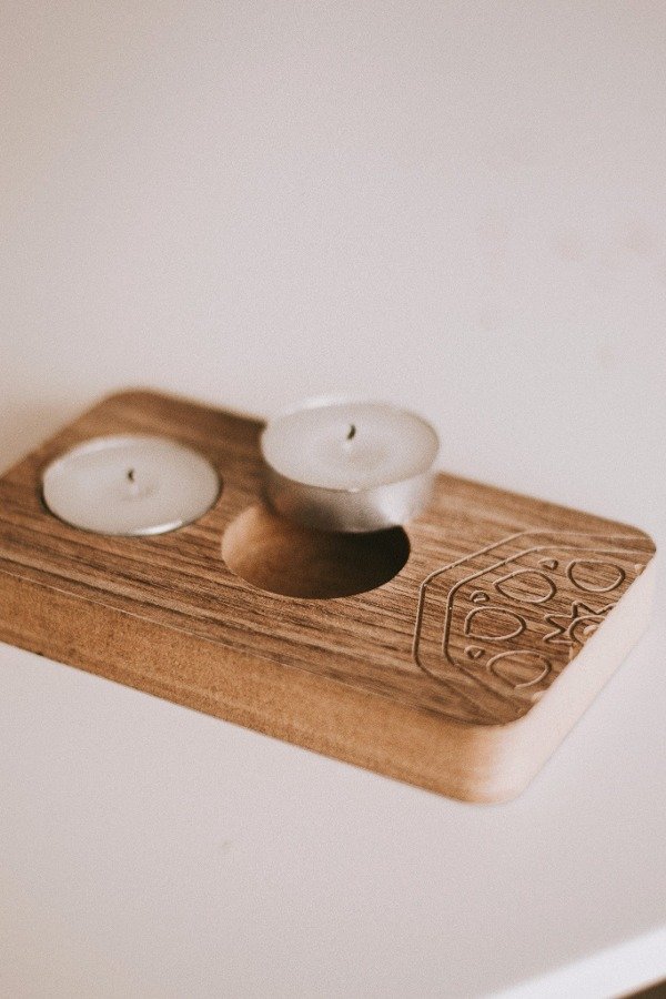• **Portavelas con 2 velas incluidas **_Medida_**s**: 13.5cm x 8cm Material: Melamina 18mm Colores: Helzinki, báltico, olmo finlandés y terrarum