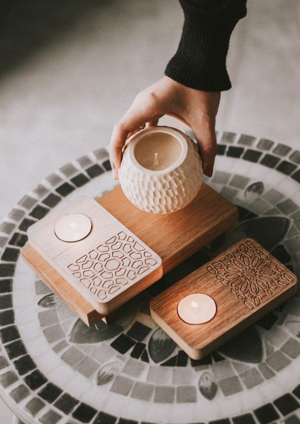 • **Portavelas con vela incluida **_Medida_**s**: 13.5cm x 8cm Material: Melamina 18mm Colores: Helzinki, báltico, olmo finlandés y terrarum