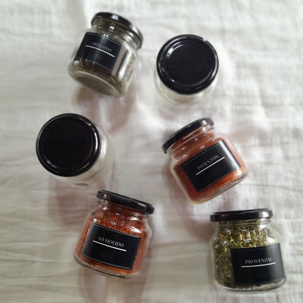 • **SET ESPECIEROS ETIQUETA NEGRA TAPA METALICA X 4 UNIDADES de 250cc El SET Incluye**: 1 Especiero de 250cc con Etiqueta "Oregano" 1 Especiero de 250cc con Etiqueta "Provenzal" 1 Frasco de 250cc con Etiqueta "Ají Molido" 1 Frasco de 250cc con Etiqueta "Pimenton"