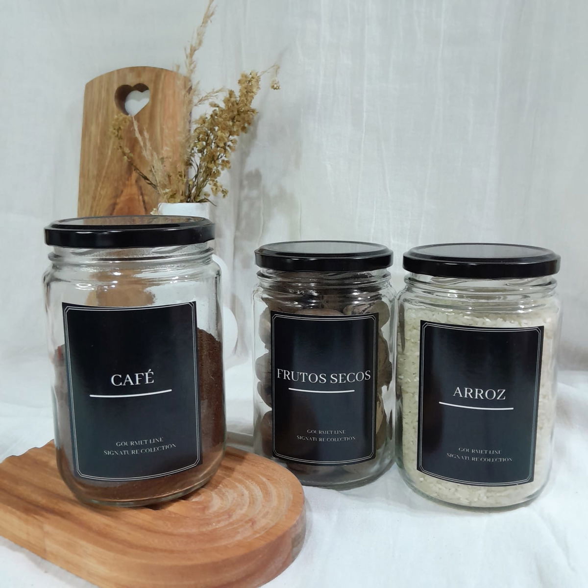 • **SET FRASCO ETIQUETA NEGRA TAPA METALICA X 3 UNIDADES MEDIANO El SET Incluye**: 1 Frasco de 660cc con Etiqueta "CAFE" 1 Frasco de 660cc con Etiqueta "FRUTOS SECOS" 1 Frasco de 660cc con Etiqueta "ARROZ"