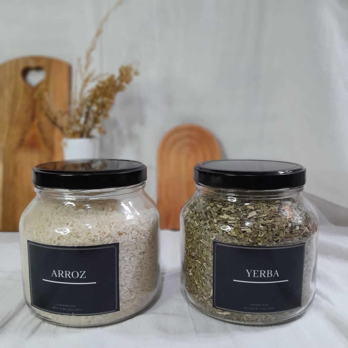• **SET FRASCO ETIQUETA NEGRA TAPA METALICA X 3 UNIDADES MEDIANO El SET Incluye**: 1 Frasco de 1550cc con Etiqueta "HARINA" 1 Frasco de 1550cc con Etiqueta "YERBA" 1 Frasco de 1550cc con Etiqueta "ARROZ"