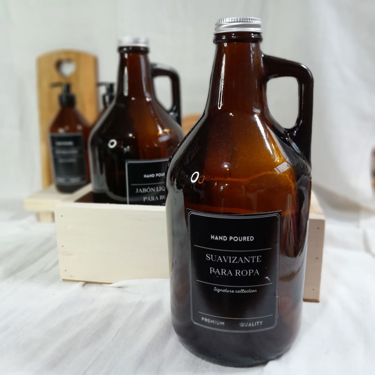 • **Botellones GLOWLERS Ambar Vidrio 1900 L Etiquetas Disponibles**: -Jabon Liquido para Ropa -Suavizante para Ropa