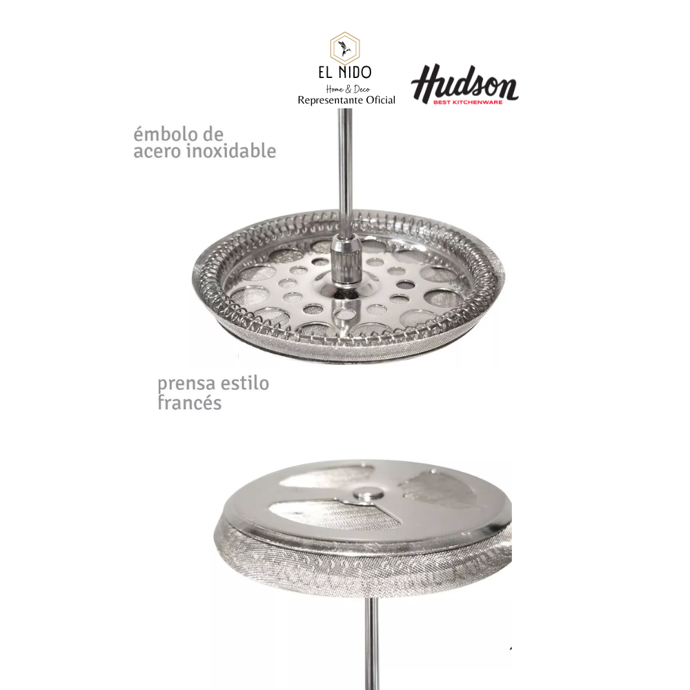 ::: QUÉ INCLUYE :::Una Cafetera Prensa Francesa Hudson Embolo 600 ml vidrio y acero + 2 vasos térmicos. Perfecta para preparar un café exquisito.