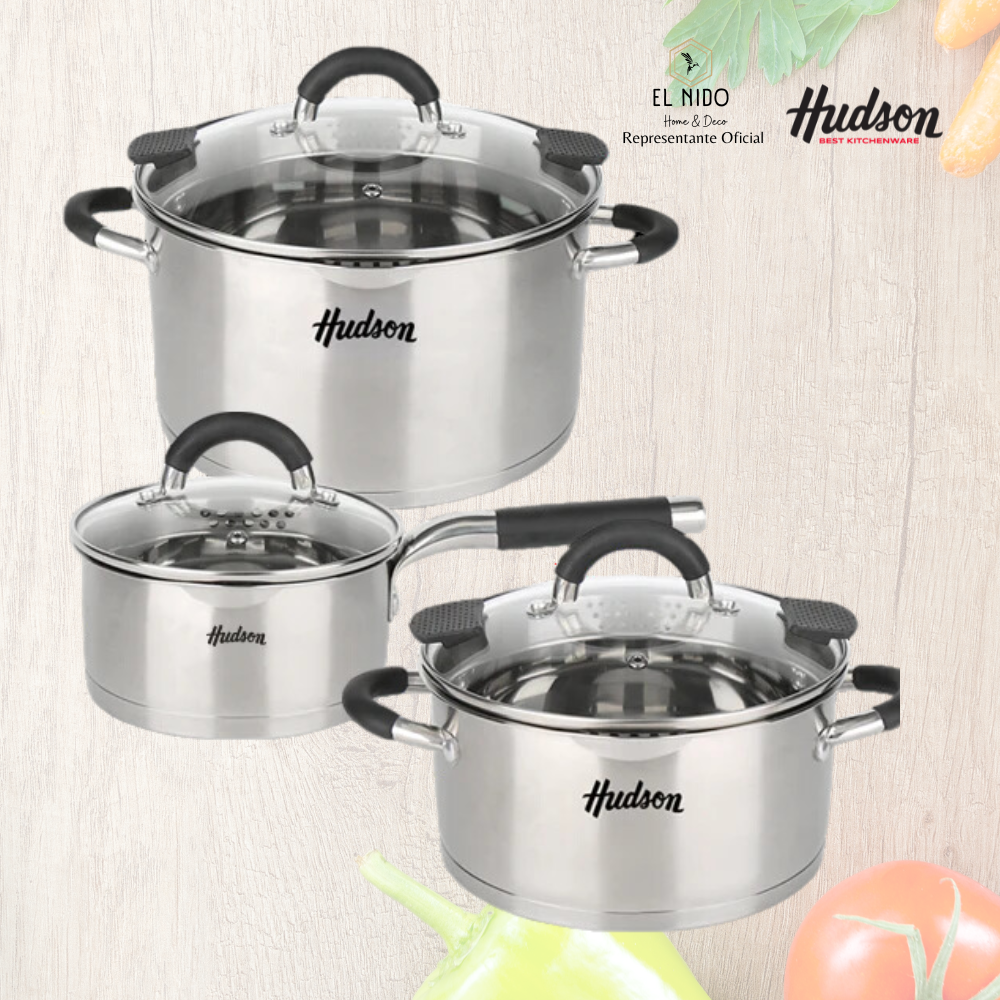 • **Batería de Cocina Hudson Acero Inoxidable 6 Piezas apta para Inducción. Incluye:- Cacerola de 24 cm con tapa de vidrio- Cacerola de 20 cm con tapa de vidrio- Cacerola de 16 cm con tapa de vidrio