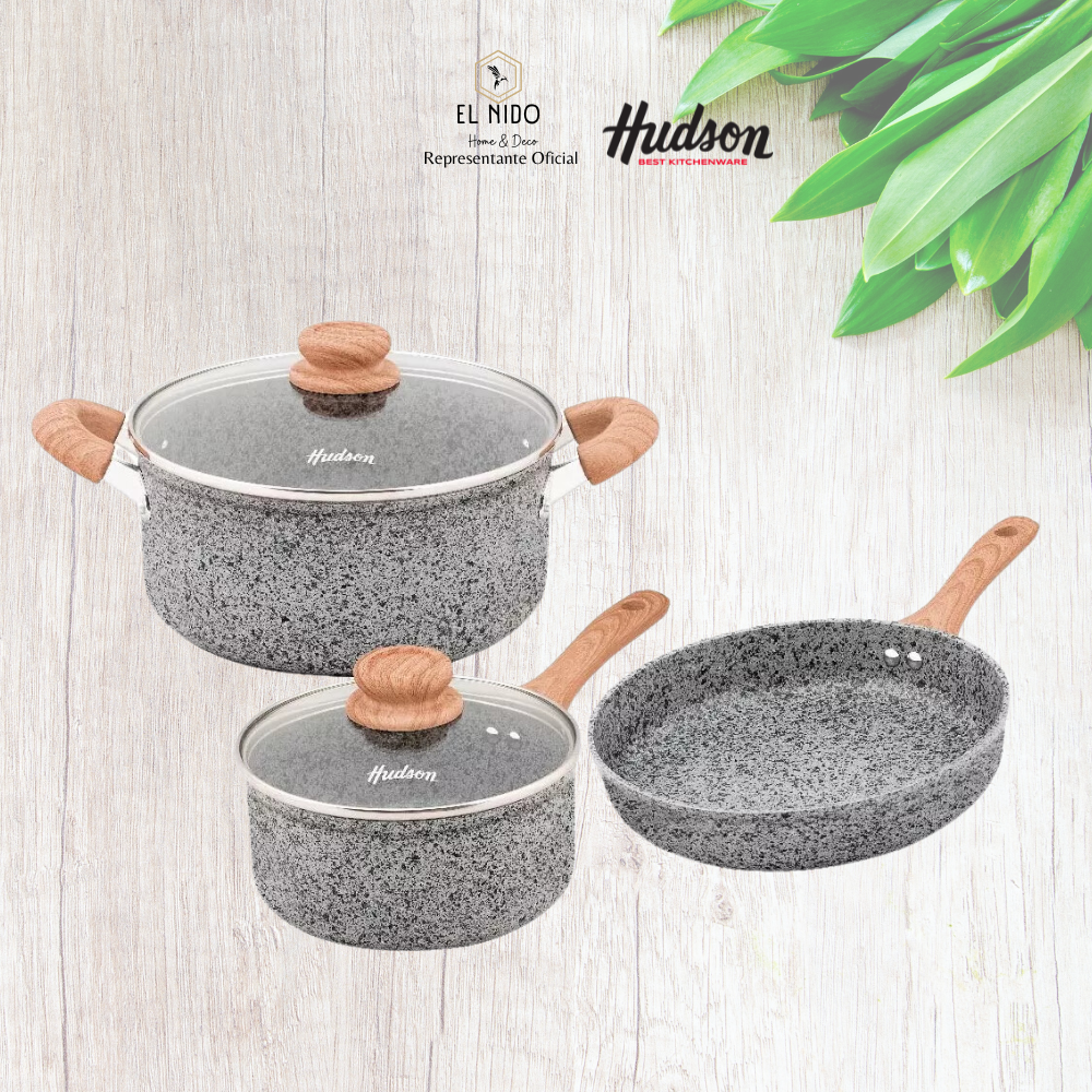 ::: QUÉ INCLUYE :::Set de ollas línea Granito Stone 3 piezas: cacerola 24 cm diámetro con tapa de vidrio; altura 13cm + cacerola 20 cm diámetro con tapa de vidrio; altura 8cm + sartén 24 cm diámetro; altura 5cm. La tapa de la olla se puede usar también en la sartén.