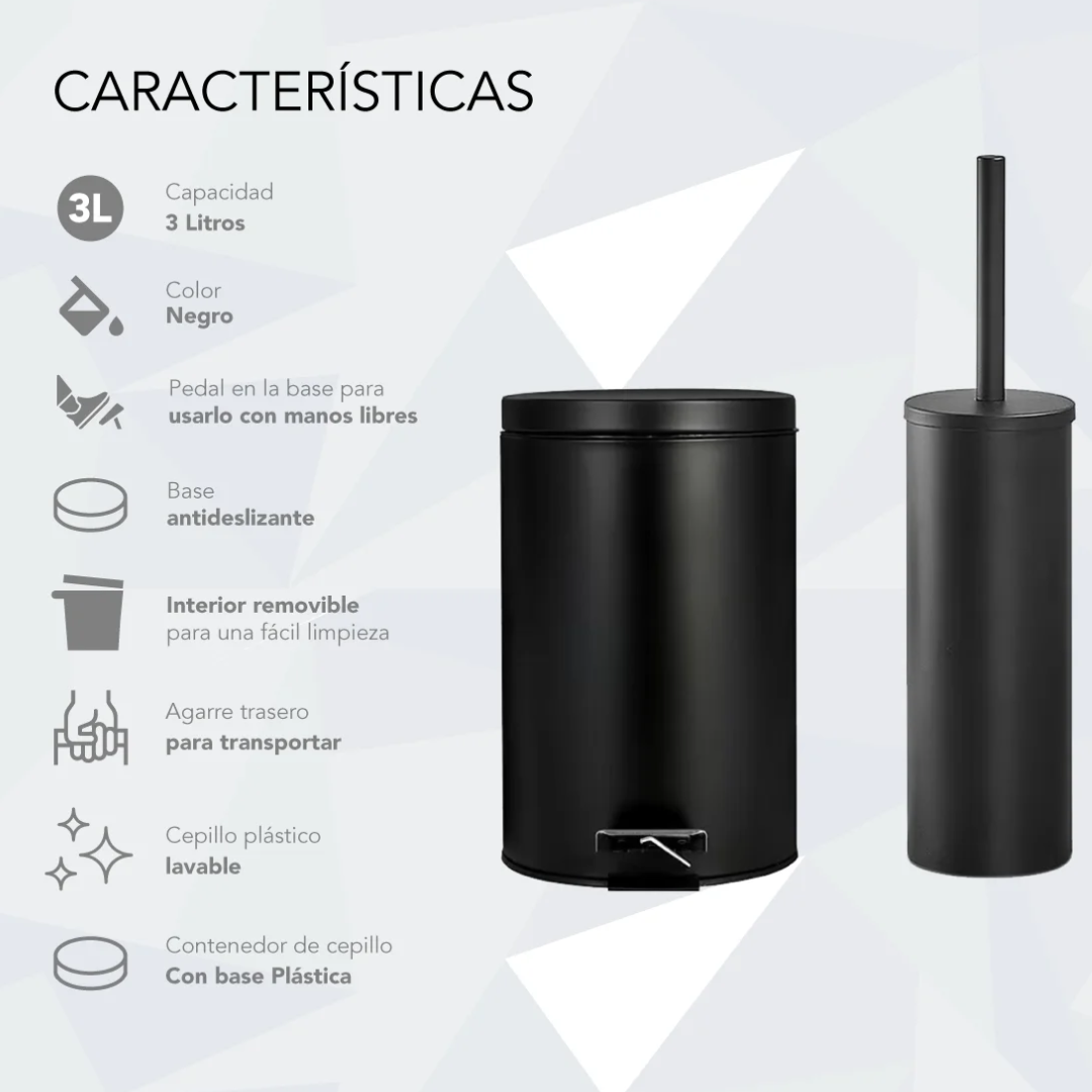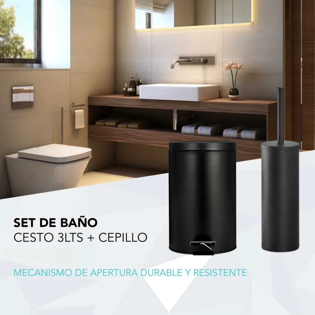 ✨ SET DE TACHO CESTO DE BASURA 3LTS NEGRO+ ESCOBILLA DE BAÑO ✨