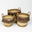 • Set de 3 canastos de rafia combinado en tonos crudo, tostado y negro, con manijas de cueroy flecos en hilo de seda.