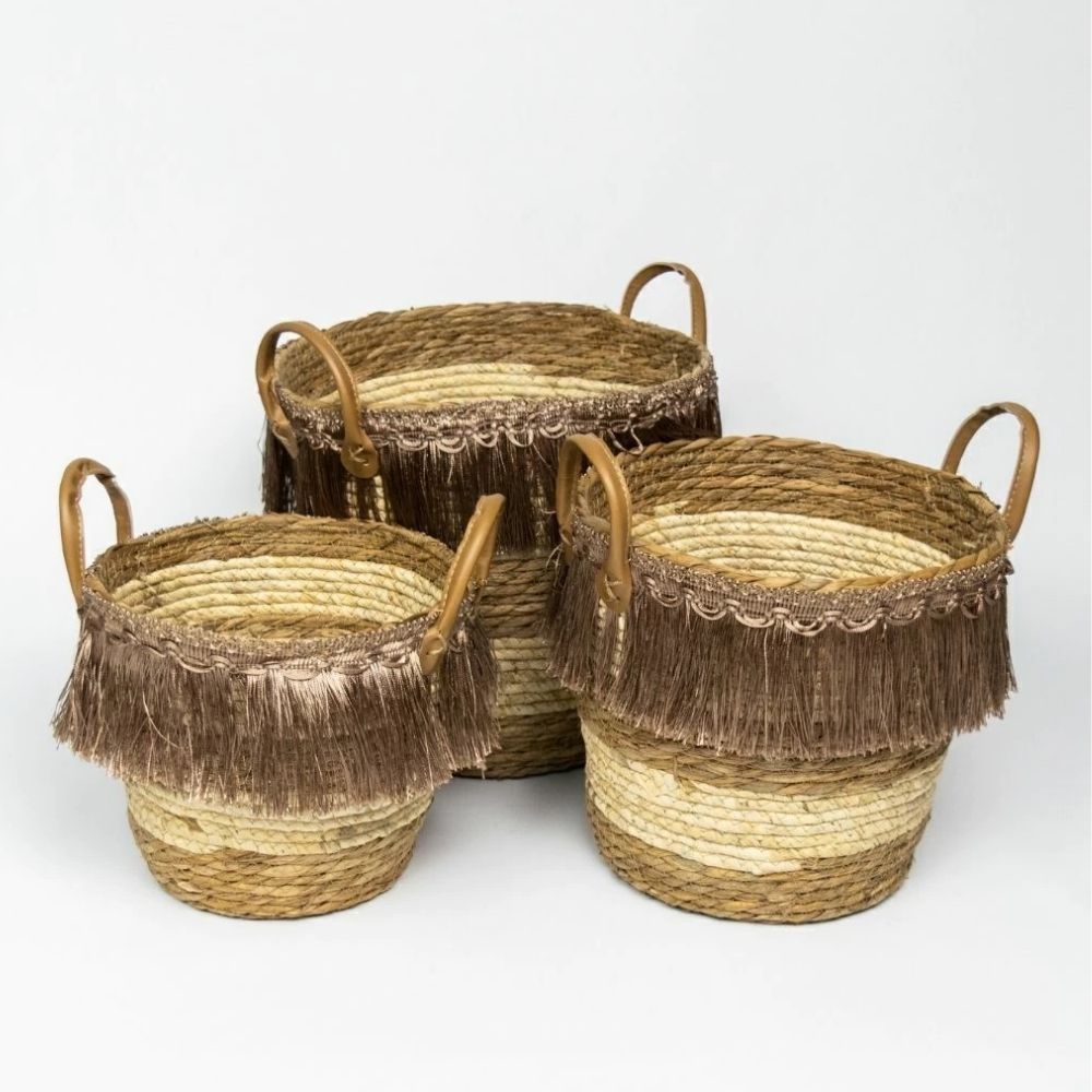 ✨ SET DE 3 CANASTOS FIBRAS NATURALES CON MANIJAS DE CUERO Y FLECOS EN HILO DE SEDA ✨