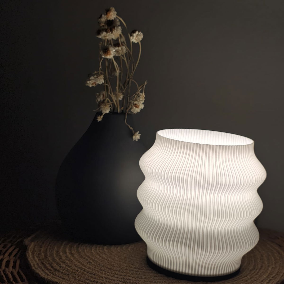 El velador Lya juega con ondas suaves y simetría perfecta.