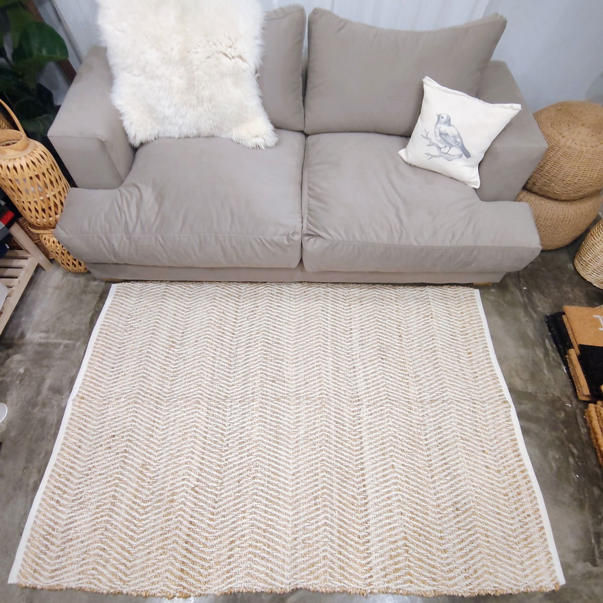 Importada de la India, esta alfombra artesanal combina fibras naturales con un diseño en zig zag que aporta textura, movimiento y calidez. El contraste entre el yute y el algodón crea una superficie visualmente atractiva, ideal para transformar cualquier espacio.
