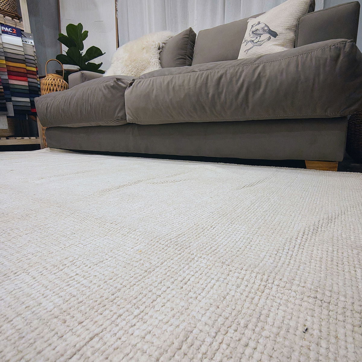 Importada de la India, esta alfombra premium de algodón destaca por su textura pesada, uniforme y de altísima calidad. Su tono crudo neutro y su tejido compacto la convierten en una opción ideal para quienes buscan un diseño sobrio, elegante y duradero.