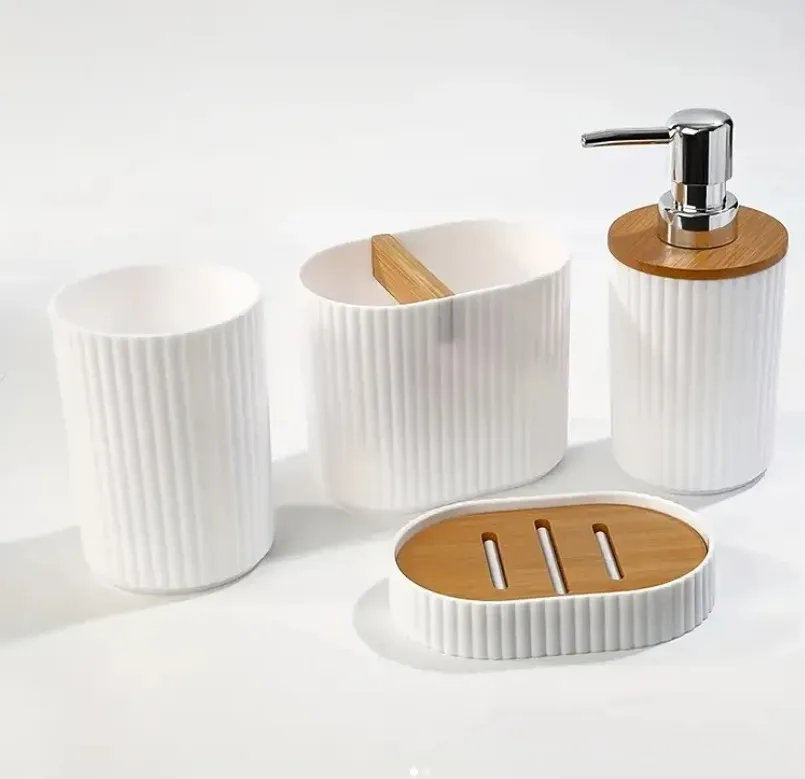 SET DE BAÑO PVC Y BAMBU 4 PIEZASDISPENSERJABONERAVASOPORTA CEPILLO DE DIENTES