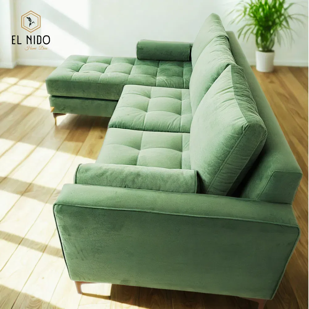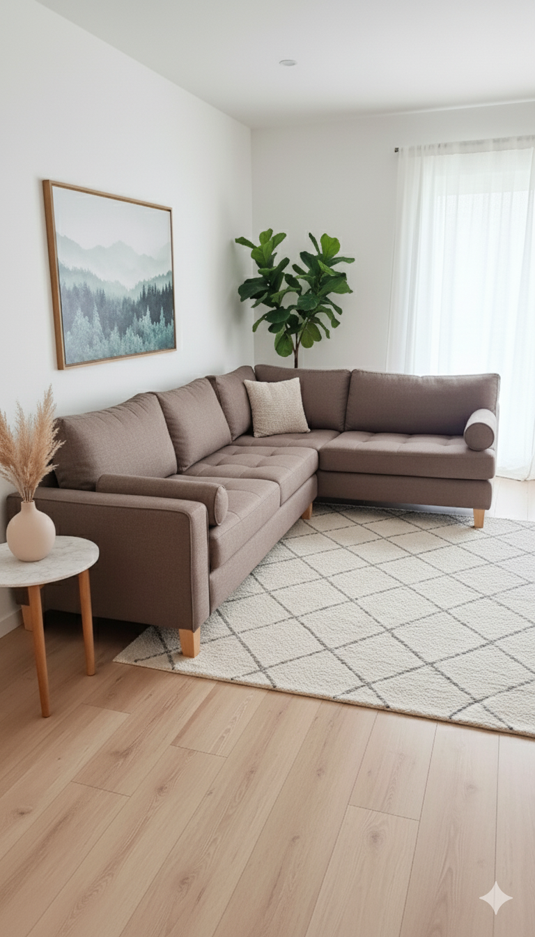 El modelo ROMA Esquinero se destaca por su estructura liviana visualmente, patas de madera estilo escandinavo y líneas limpias que dan una sensación de orden y amplitud. Es ideal para quienes buscan un sofá funcional y elegante que acompañe el estilo sin recargarlo.