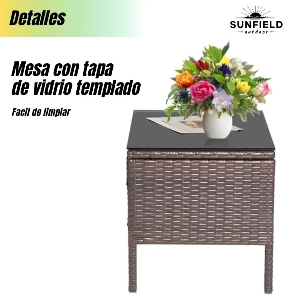 Resistencia al Clima: El set es completamente resistente al agua y a la humedad. El ratán también posee resistencia a los rayos UV, previniendo la decoloración y el deterioro por exposición solar.
