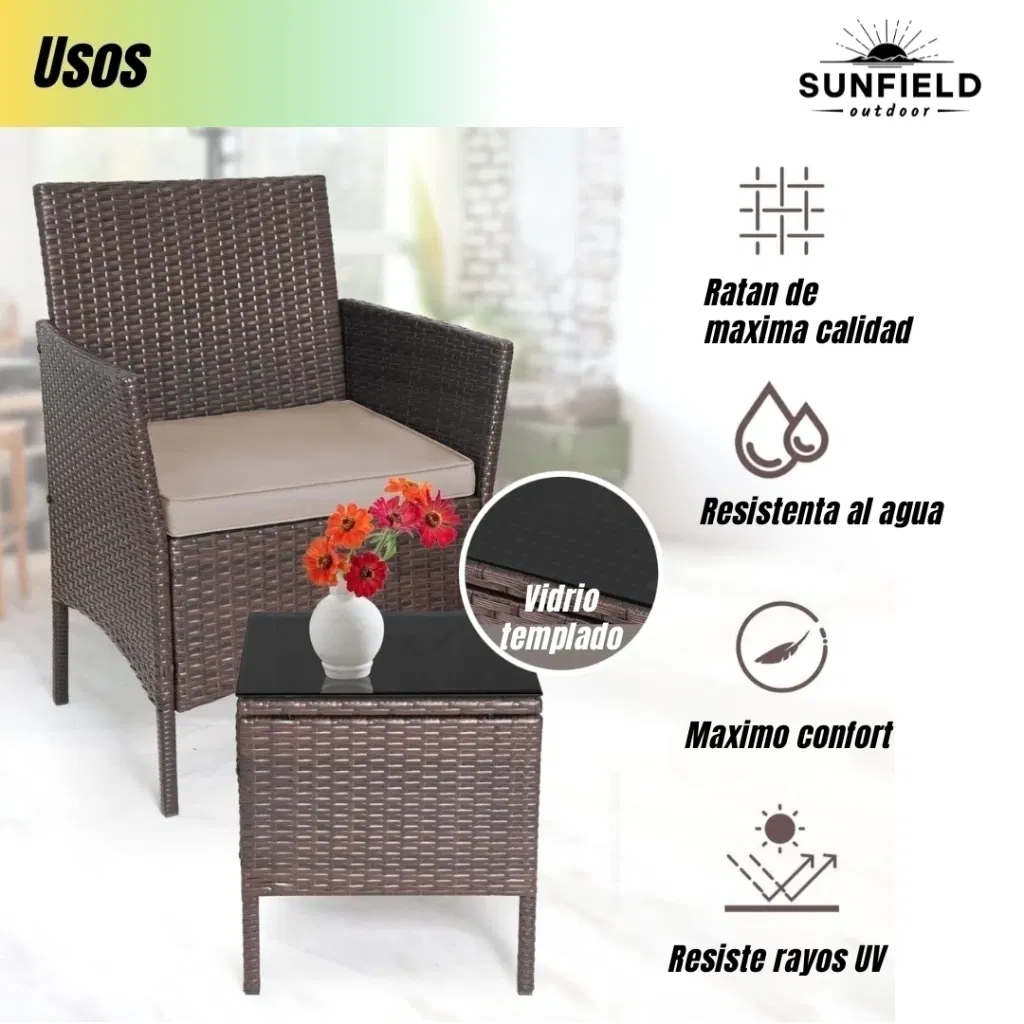 Resistencia al Clima: El set es completamente resistente al agua y a la humedad. El ratán también posee resistencia a los rayos UV, previniendo la decoloración y el deterioro por exposición solar.
