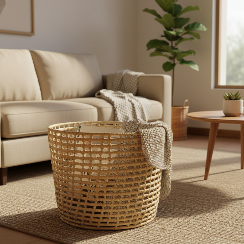 🌿 Cesto de palma y carandillo hecho a mano, ideal para organizar con estilo. ✨ Su textura natural y diseño artesanal lo convierten en un complemento decorativo único. 🏡 Perfecto para mantas, juguetes o plantas. 💛 Cada pieza es única y transmite calidez.