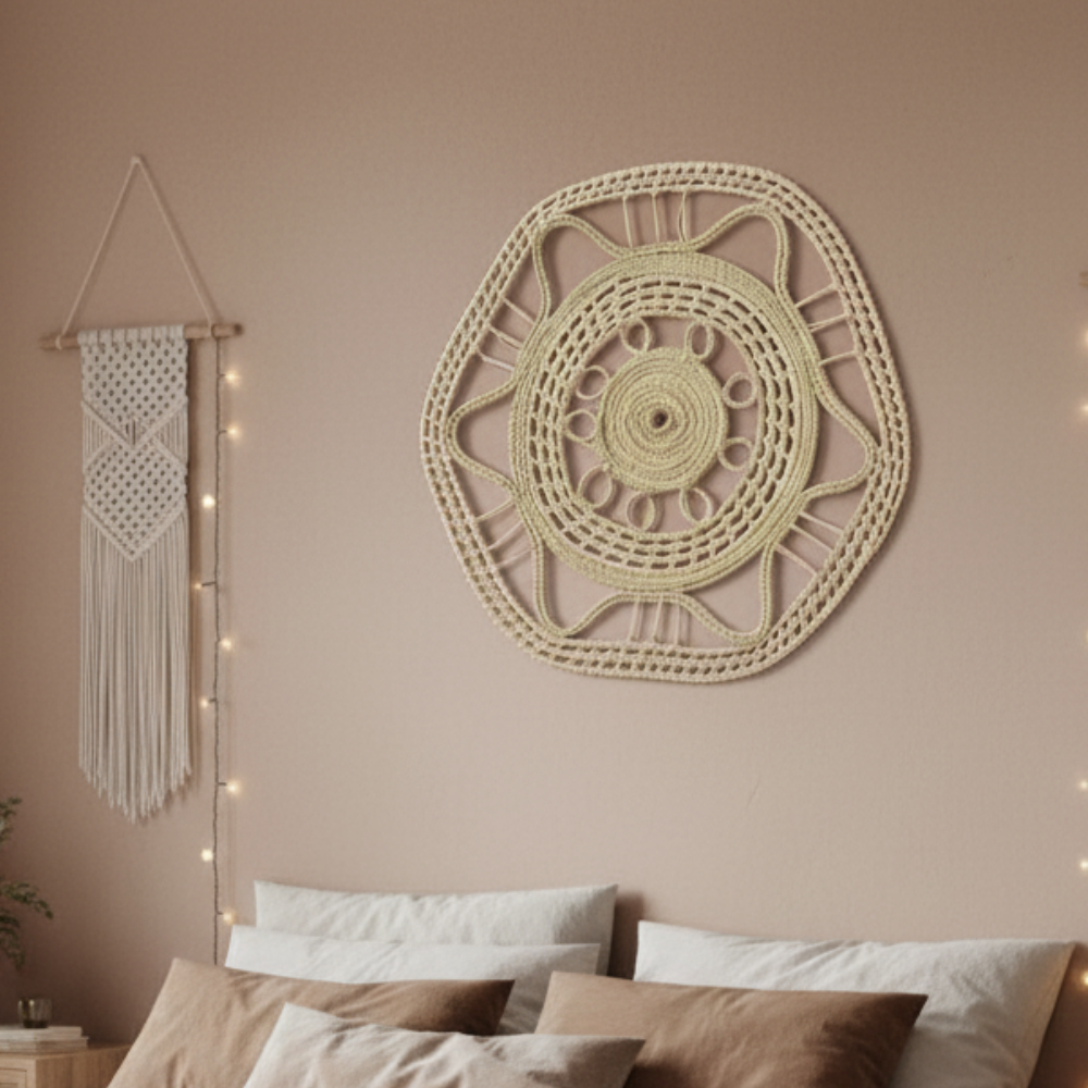 ✨ Aporta un toque bohemio a tus paredes con este colgante deco de palma y carandillo. 🌿 Hecho a mano con fibras naturales, ideal para dar textura y calidez a tus ambientes. 🏡 Perfecto para livings, dormitorios o galerías. 💛