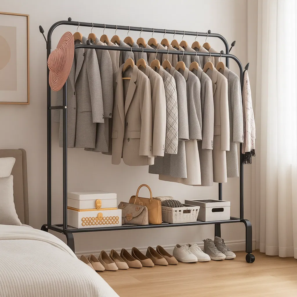 🏡 Practicidad y estilo en un solo producto. Este perchero metálico con doble barral te permite organizar tu ropa y accesorios con total comodidad. ✨ Su estructura con ruedas facilita el movimiento y la funcionalidad en cualquier ambiente.