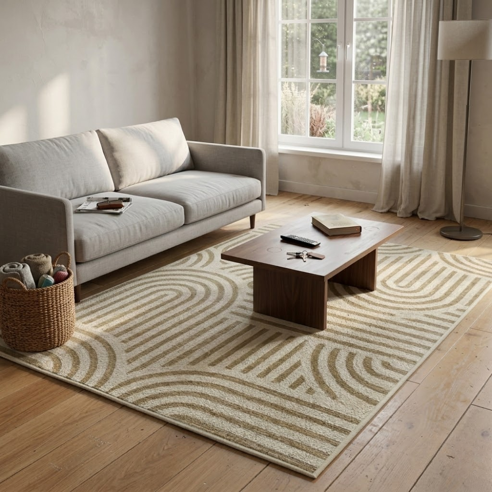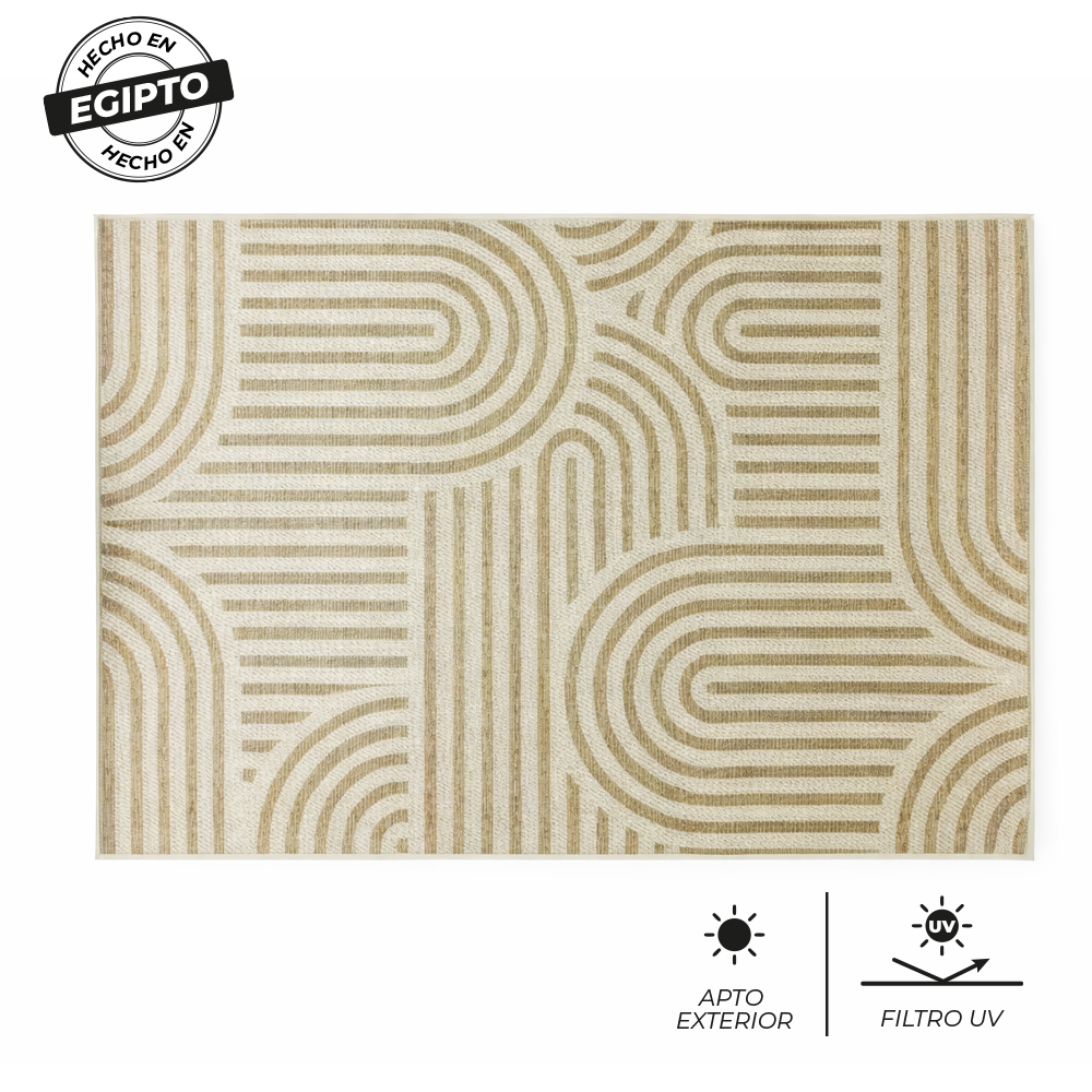 Carpeta 133 x 190 cm con base natural y diseño de laberintos circulares en beige. Ideal para living o comedor. Combina estética artesanal con un diseño moderno y sofisticado.