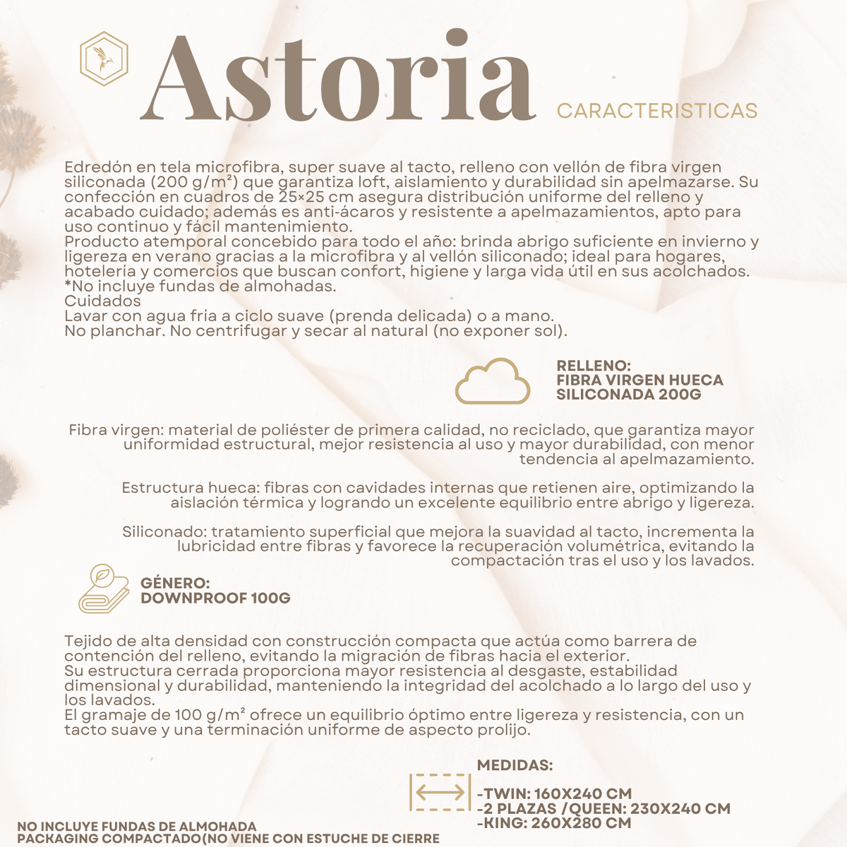 Edredón en tela microfibra, super suave al tacto, relleno con vellón de fibra virgen siliconada (200 g/m²) que garantiza loft, aislamiento y durabilidad sin apelmazarse. Su confección en cuadros de 25×25 cm asegura distribución uniforme del relleno y acabado cuidado; además es anti‑ácaros y resistente a apelmazamientos, apto para uso continuo y fácil mantenimiento.