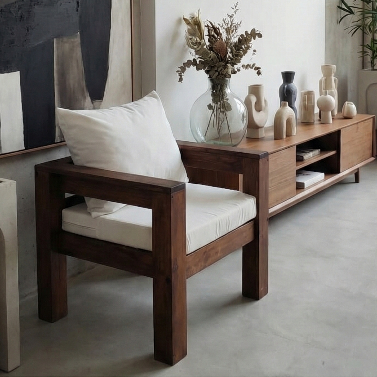 Hay piezas que transforman un rincón en un lugar con alma. Este sillón de eucalipto macizo es una de ellas: presencia natural, estructura sólida y ese equilibrio entre calidez y simpleza que hace que cualquier ambiente gane en personalidad. Ideal para un dormitorio, una sala de lectura o para complementar tu living con un toque orgánico y auténtico.