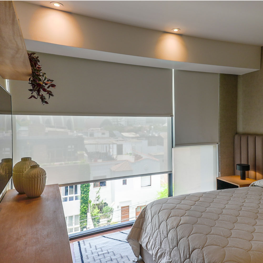 Las Cortinas Roller Dobles combinan en una sola ventana dos sistemas complementarios: Sunscreen y Blackout, permitiéndote controlar la luz del ambiente según el momento del día.